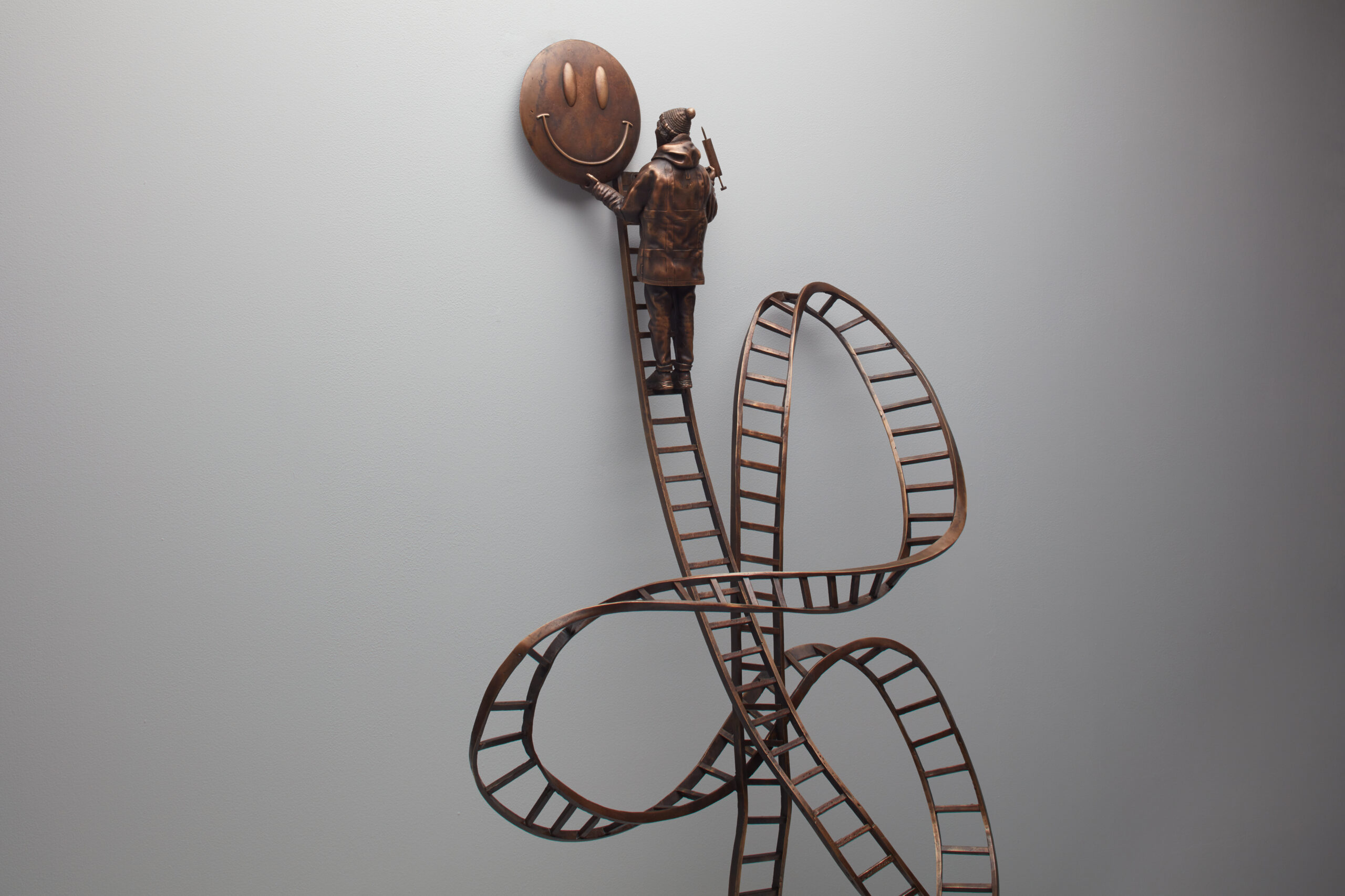 “Frankey” finds a new spot each week to inspire playful, often ironic installations. From a bridge support transformed into a rhinoceros to a police car leaping over a portico to a miniature surfer riding an awning, his pieces celebrate humor and happiness.