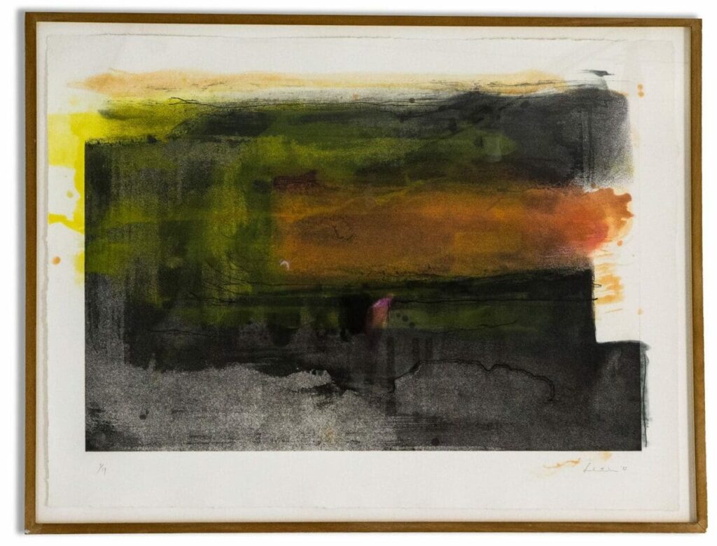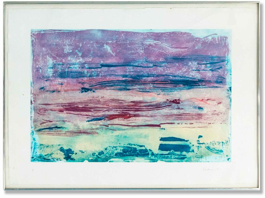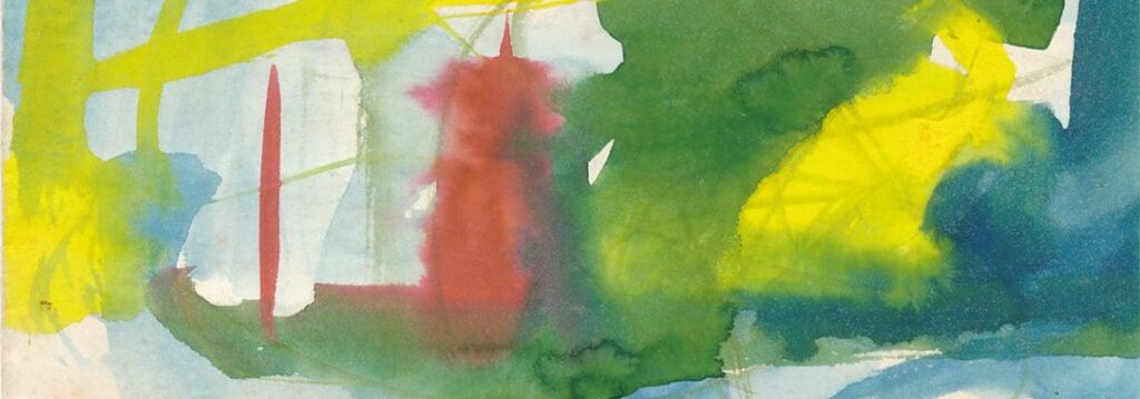 Frankenthaler’s early works reflect a variety of influences, but after 1951 she developed a style of her own. Inspired by Jackson Pollock, creator of the dripping technique, which consists of splashing paint onto the canvas, Frankenthaler used highly diluted paint to soak or stain unprepared canvases, with which she created diaphanous lakes of soft colors, such as the delicate pinks and blues of ‘Mountains and Sea’ (1952), Frankenthaler’s most important work. Both this and later works, although abstract, contain clear evocations of landscape.