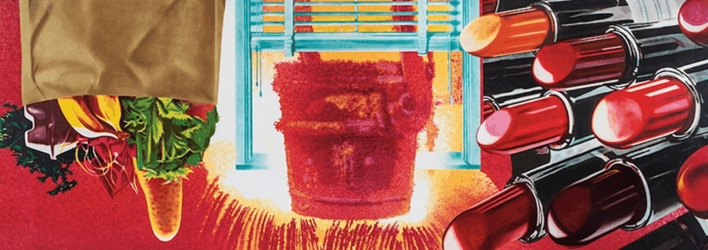 Rosenquist developed his characteristic style based on the effect of using a billboard style of painting on smaller canvases, where the images became softly blurred and their literal quality was lost in the close-up orientation and the cropping of the image. Transitioning away from cultural references into the more abstract subject matter. Rosenquist also played with shifts in scale and technique—for example, employing grisaille and full color—and juxtaposed several disparate motifs in a single canvas. The completed painting would be a disjunctive display of various pop images that presaged the postmodern strategy of pastiche, as in the later work of David Salle.